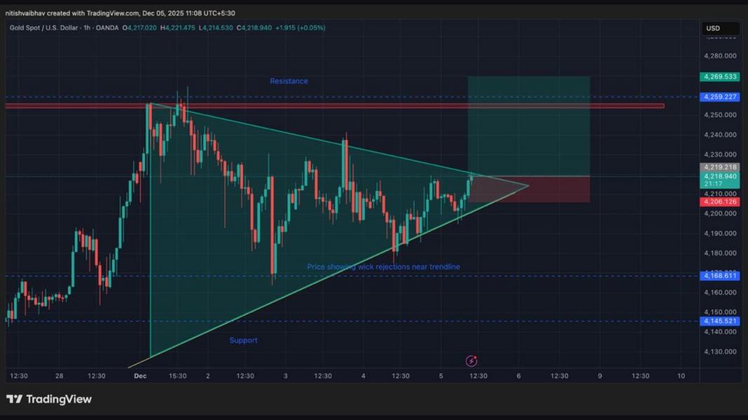 On the technical side, the one-hour timeframe highlights a ranging trend that showcases price consolidation. This coiling action forms as market participants await a decisive move. The symmetrical triangle pattern signifies a notable period of volatility compression. Traders are eyeing the major resistance level at 4,259.227 as a potential target should the price break out upwards. On the downside, critical support levels are identified at 4,168.811 and 4,145.521, underscoring where downward movement might be supported.